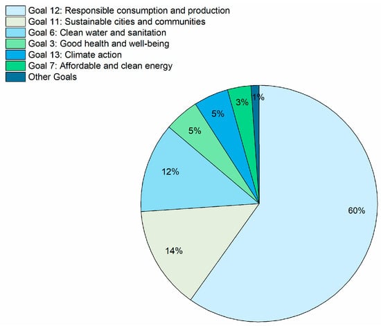 The relationship between this research domain and the Sustainable Development Goals (SDGs) defined by the United Nations is closely linked to the studies developed in “foundry waste” (Figure 8). The correlation between studies on foundry waste and the SDGs demonstrates an alignment that will allow addressing the main global sustainability challenges, acting on various objectives and targets of the 2030 Agenda. About 60% of the published articles are related to Goal 12: Responsible Consumption and Production, making it the most relevant, as it is related to waste management, including the reduction, reuse, and recycling of materials, highlighting the importance of foundry waste management.