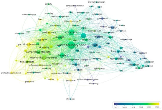 The last analysis was created using VOSviewer (Version 1.6.20), with the same database. This analysis generated an image that shows the most relevant keywords in this investigation, using the topic “foundry waste” (Figure 9). Keywords are visualized based on their frequency and co-occurrence, with size and connections indicating their importance and relationships. The color gradient represents the average year of publication, highlighting both past and current trends in foundry waste research.