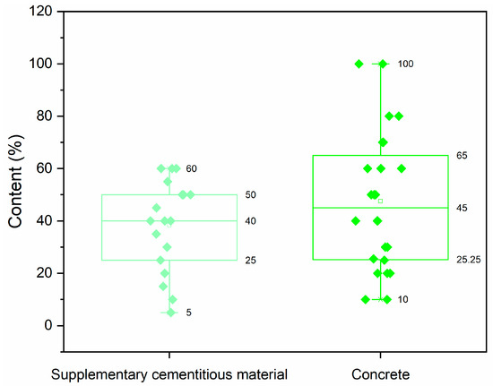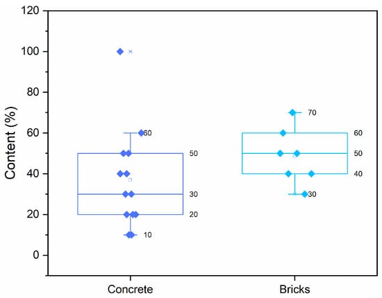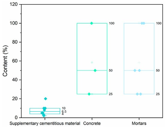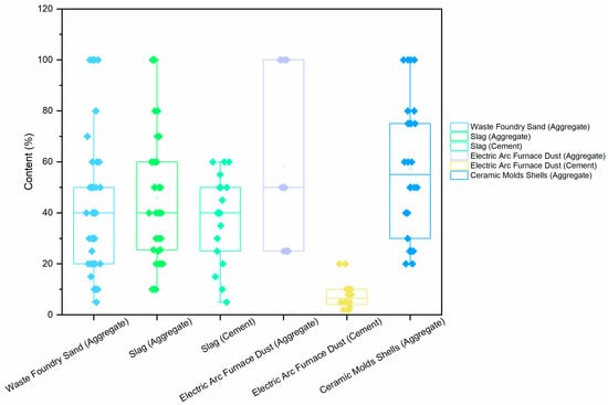 In addition, an analysis of the replacement content of different residues in construction materials is provided in the following subsections. Figure 10 summarizes the findings. Waste foundry sand and ceramic mold shells are capable of replacing aggregates in construction materials, while slags and electric arc furnace dust can serve as replacement for both aggregates and cement. Most residues exhibit a broad content range, except for the electric arc furnace dust used as cement replacement, which shows the narrowest and lowest content percentage.