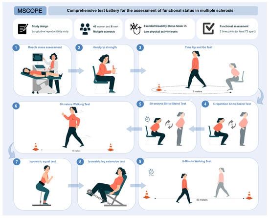 This study aimed to evaluate the reliability and validity of a battery of tests (MScope battery) designed to assess functional capacity in PwMS. The reliability of the test battery was confirmed by high ICC values, indicating a high degree of consistency in the measurements. All the analyzed structural, functional, and neuromuscular variables demonstrated excellent intra-day reliability, with ICC values exceeding 0.92. These high values showed that the tests yielded consistent results on the same day. Moreover, most tests exhibited good-to-excellent test–retest reliability, with ICC values ranging from 0.775 to 0.973, indicating consistent results across different assessment sessions. However, significant differences between sessions were observed in functional tests, likely due to factors such as task familiarization or sensitivity to minor changes in functional capacity, while structural and neuromuscular assessments showed greater stability. This reproducibility, coupled with the exploratory factor analysis supporting the construct validity, underscores the robustness of the battery. Thus, this is the first study to propose a reliable and valid set of functional, structural, and neuromuscular tests to comprehensively assess functional status in PwMS.
