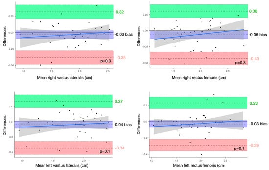 Bland–Altman plots for muscle mass assessments in vastus lateralis and rectus femoris.