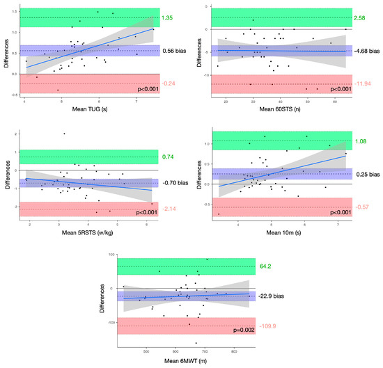 The Bland–Altman plots for the muscle mass, functional capacity, and neuromuscular assessments are shown in Figure 2, Figure 3, and Figure 4, respectively. All structural (Figure 2) and neuromuscular (Figure 4) data did not show significant differences; however, all the functional tests showed significant differences (Figure 3) (TUG: t = 8.6, p < 0.001; 60STS: t = 8.1, p < 0.001; 5RSTS: t = 6.2, p < 0.001; 10MWT: t = 3.8, p < 0.001; 6MWT: t = 3.3, p = 0.02). Heteroscedasticity was not presented in the results (see Supplementary File S2) except for TUG, MVICSQ, and UMVICLEXT_L.