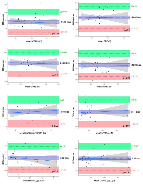 Bland–Altman plots for neuromuscular assessments. Abbreviations: GRF, peak isometric ground reaction force; MVICLEXT, maximal voluntary isometric contraction during the leg extension exercise; MVICSQ, maximal voluntary isometric contraction during the squat exercise; UMVICLEXT_L, unilateral left leg extension maximal voluntary isometric contraction; UMVICLEXT_R, unilateral right leg extension maximal voluntary isometric contraction.