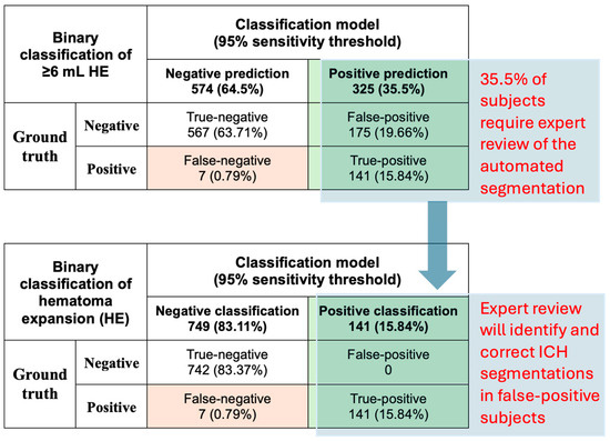 An example of an HE classification workflow with a high-sensitivity (95%) threshold classification. Combined segmentation and classification pipeline identifies the majority of subjects with HE (141 out of 148, 95.2%), and expert review of automated segmentations is limited to 35.5% of the subjects, correcting false-positive cases. This process results in 99.21% accurate HE classification in the whole dataset, with a final 0.7% false-negative rate. Notably, expert reviewers spend only a third of the time required for examining segmentations in the entire dataset, by focusing on test positive subjects, significantly improving efficiency. The approach is practical and efficient for generating ground truth annotations of HE in large ICH datasets.