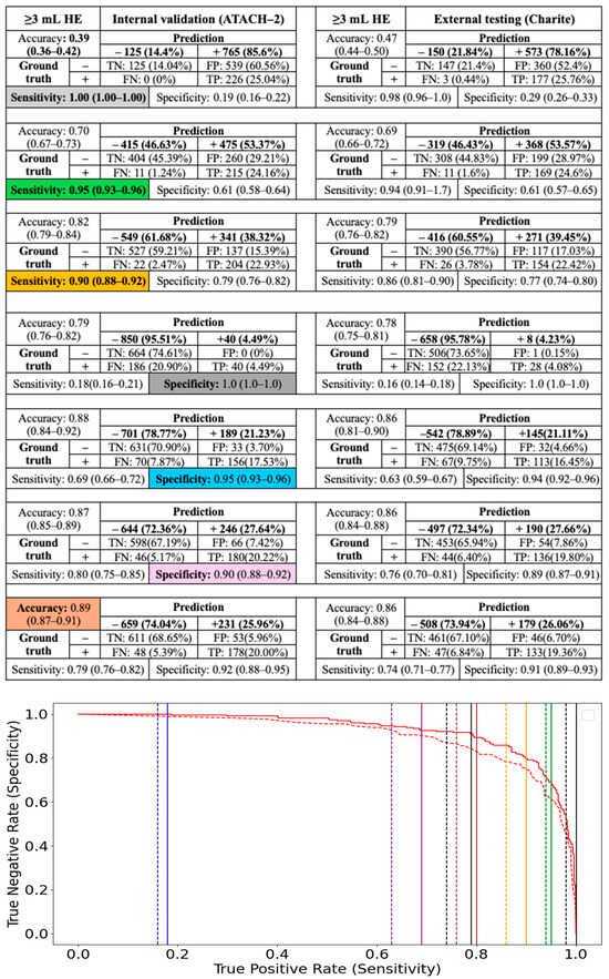 Classification of ≥3 mL HE using CNN model and thresholds for 100%, 95%, and 90% sensitivity and specificity, as well as the highest accuracy threshold, in the internal test cohort (ATACH-2). These thresholds were then applied to the external validation cohort (Charité). The solid and dashed lines in the ROC curve refer to same-color sensitivity/specificity thresholds (as color coded in table cell) in the internal and external validation cohorts, respectively.