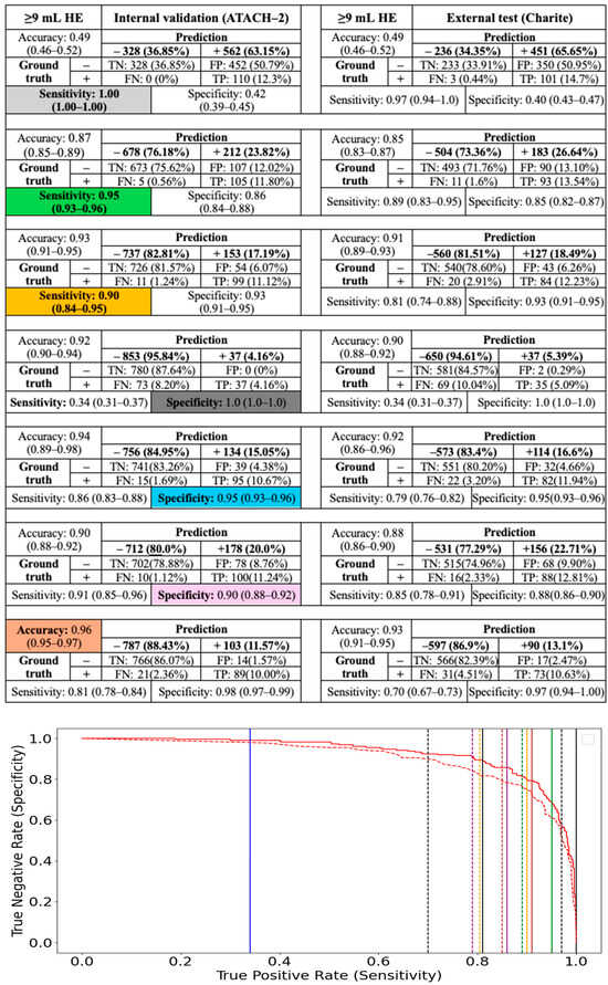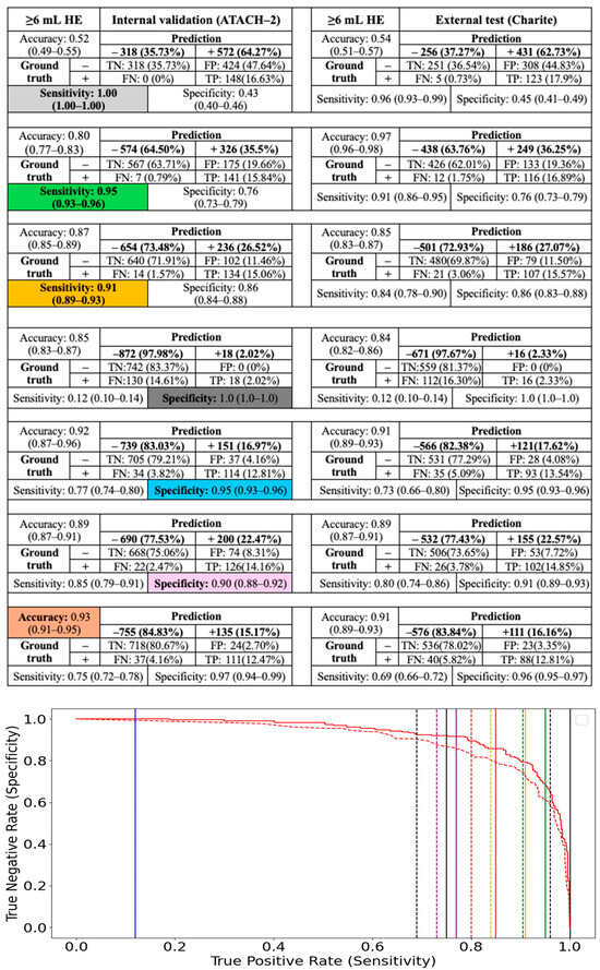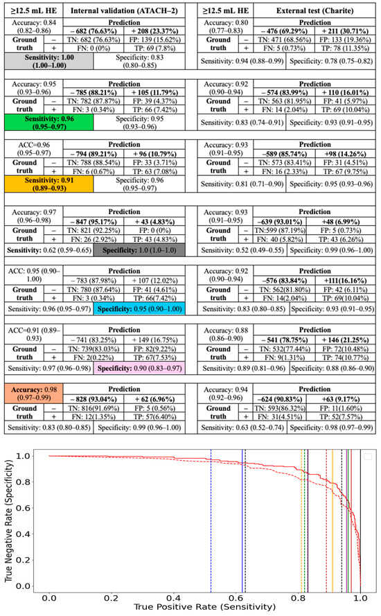 Classification of ≥9 mL HE using CNN model and thresholds for 100%, 95%, and 90% sensitivity and specificity, as well as the highest accuracy threshold, in the internal test cohort (ATACH-2). These thresholds were then applied to the external validation cohort (Charité). The solid and dashed lines in the ROC curve refer to same-color sensitivity/specificity thresholds (as color coded in table cell) in the internal and external validation cohorts, respectively.