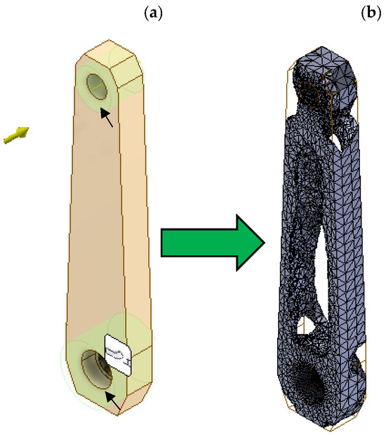 As mentioned previously, an improved crank arm design was developed from the conventional crank design detailed earlier. The topology optimization was performed using software such as Autodesk Inventor 2025® and Autodesk Inventor Nastran 2025®. In order to obtain a first approach, the Shape Generator tool from Autodesk Inventor was used. In the Shape Generator settings, Young’s modulus was defined as 72 GPa, and the applied load was set to 1300 N at an angle of 45°, 65 mm from the crank arm’s cross-sectional plane (yellow arrow in Figure 2a), as specified in the NP EN ISO 4210-8:2019 [15] standard for adults and youth leisure bicycles. Furthermore, two cylinders from the standard shape were preserved, as marked with black arrows in Figure 2a, and 206,691 tetrahedral elements were used to perform the Finite Element Analysis (FEA).