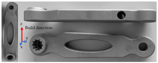 After defining the final geometry, six crank arms were produced using the L-PBF process with AlSi10Mg using a Renishaw machine, AM 400 model (Technical Laboratory Systems, Inc., Katy, TX, USA). The main process parameters were a laser power of 350 W, a layer thickness of 30 μm, a scanning speed of 1.8 m/s, and a beam diameter of 70 µm. The nominal chemical composition of the AlSi10Mg aluminum alloy is summarized in Table 3. Figure 4 illustrates an as-build crank arm produced in this work. The relative density of the printed part was about 99.7%.