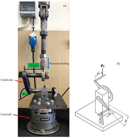 The fatigue tests were performed on a test bench specifically developed for this purpose, based on the NP EN ISO 4210-8:2019 standard [15]. Figure 5a shows a real photograph of the test bench, and Figure 5b illustrates the standard suggestion.