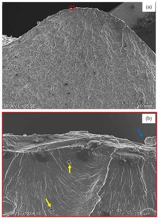 A detailed observation of the SEM images presented in Figure 9a,b clearly shows that the crack initiation was localized in a superficial porosity; these are representative of both cases (as-build and HT). In Figure 9b, unfused particles (blue arrow) and internal porosities (yellow arrows) can also be observed. These defects are very common in the L-PBF process, especially when it is applied to aluminum alloys [24].