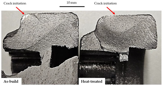 Figure 10 presents a comparison between the fracture surfaces of a non-heat-treated crank arm that reached 94,312 fatigue life cycles and a heat-treated one that reached 125,549 fatigue life cycles. This figure shows clearly that the crack initiation position was similar in both cases, with the crack initiation location being where the stresses are highest, as previously described. In a direct comparison, it can be stated that the heat treatment increased the fatigue life by 33%, at least due to less sensitivity to defects and surface roughness obtained with the heat treatment. Materials with high hardness, such as the as-build in this case, tend to exhibit greater notch sensitivity. This is because their limited capacity for plastic deformation prevents the redistribution of concentrated stresses in the superficial defects. As a result, cracks initiated at superficial defects rapidly, leading to material failure. In contrast, the HT series showed lower hardness but greater ductility, demonstrating reduced notch sensitivity. Their ability to undergo plastic deformation allows stresses to be redistributed around superficial imperfections, increasing the fatigue life [9].