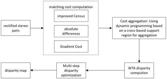 The proposed algorithm primarily consists of four steps: cost computation, cost aggregation, disparity computation, and disparity optimization. Figure 1 illustrates the flowchart of the proposed algorithm. The specific steps are as follows: