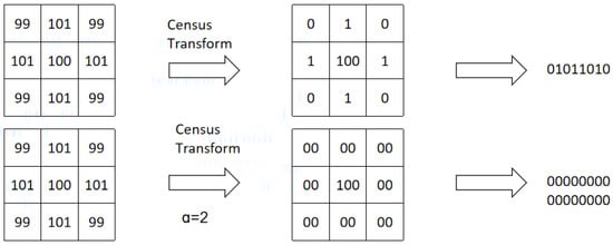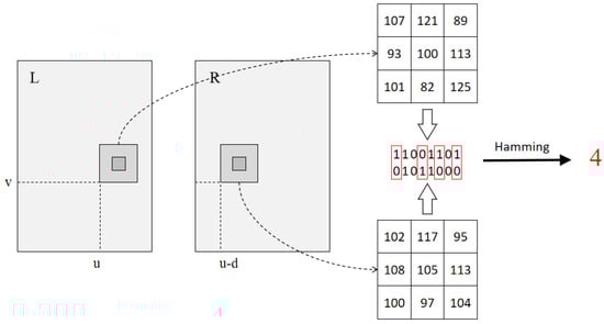 where represents the Census cost of pixel p at disparity d; is the Census transform code of pixel p in the left image; and is the Census transform code of pixel in the right image. The calculation process described above is illustrated in Figure 2.