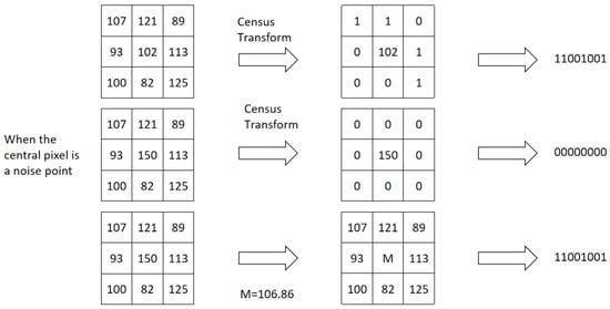 Next, the gray values within the window are sorted, the maximum and minimum values are removed, and the mean of the remaining values is calculated. This mean is used as the new central pixel value and reference value, against which the gray values of neighboring pixels in the window are compared. Figure 3 illustrates the limitations of the traditional Census transform and compares it with the proposed improved Census transform. It can be observed that even when the central pixel is disturbed, the improved bit string is less affected. Therefore, the algorithm reduces dependence on the central pixel.