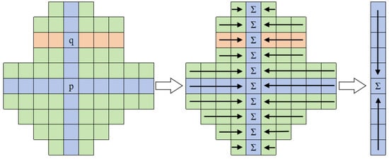 Pass 2: For all pixels, sum the temporary values stored in the first step for the pixels on their vertical arms to obtain the final aggregated cost value for that pixel. To keep the aggregated value within a small and controllable range, the final aggregated cost value needs to be divided by the total number of pixels in the support region, as illustrated in Figure 7.