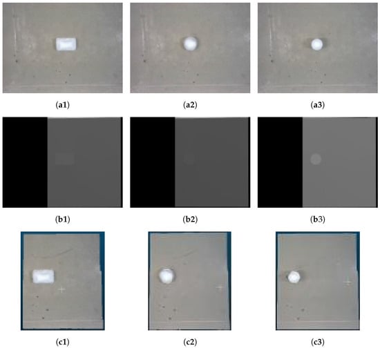 Experimental results. (a1–a3) Photographs of the physical objects on the left; (b1–b3) Disparity maps; (c1–c3) Point cloud diagrams.