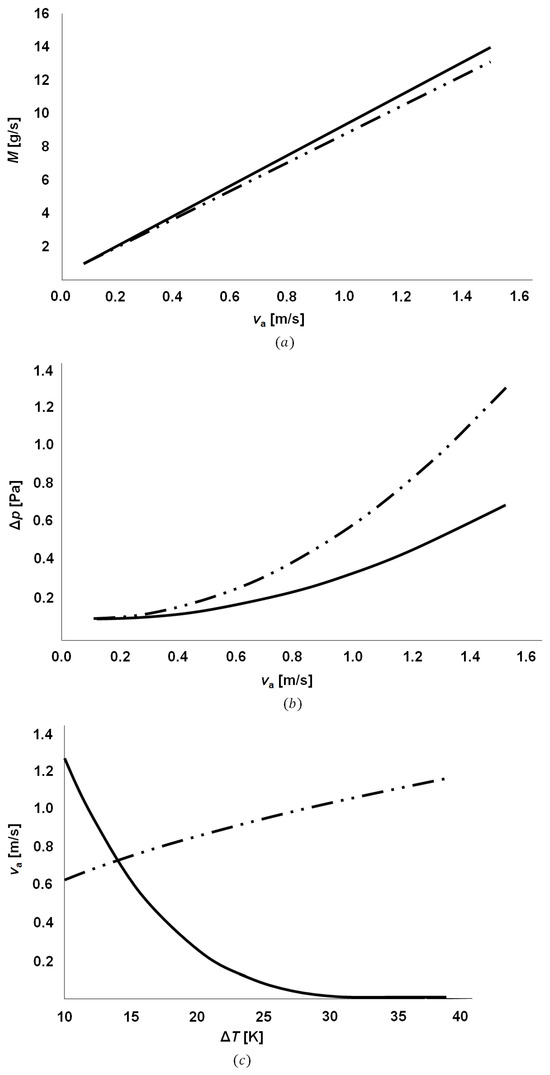 To further investigate, the simulation results were compared with the model, Equations (1)–(3), and shown in Figure 3. In Figure 3, the dashed line represents the analytical results, while the bold line represents the results obtained numerically in the ANSYS software for (a) the mass flow rate of the air within the tower, (b) the pressure difference, and (c) the speed of the air. The mass flow rates obtained analytically and numerically have approximately the same slopes, which implies that the ANSYS simulation approximates the real event well. Figure 3b shows that the simulated pressure difference also has the same physical dependence as the model. However, as the simulation in Figure 2b illustrates, the pressure difference is much less than what is required (dashed line) to establish spontaneous flow. The increase in temperature difference would usually increase the pressure difference, and the particles would accelerate as shown in Figure 3c with the dashed line. However, the small geometry causes high-energy particles to interact with boundaries more frequently, hindering upward drafts (Figure 3c, bold line).