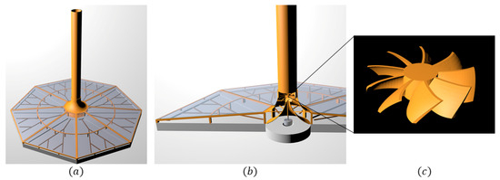 In AutoCAD software, a realistic layout of the elements was finely tuned based on the previously listed features. The 2D drawings were then transferred to SOLIDWORKS, where the assembly of the parts into a single unit and the general appearance of the would-be mock-up were tested. The created 3D models were used for 3D printing of the parts and forwarded to the Cinema 4D software, where colors and effects were added for a realistic display of the model. Figure 4a,b show the 3D model of the solar chimney power plant in Cinema 4D software. As seen in Figure 4a,b, the solar chimney power plant has the following characteristics: divergent shape of the tower, collector roof divided into eight partitions and slightly inclined, with the collector also layered.
