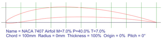 As the blade profiles of classic wind turbines, as well as those obtained by the inverse method, are made to serve larger systems [29], they are not suitable for a mock-up of these dimensions. Therefore, the final profile was based on fans for personal computers, specifically the NACA 7407 airfoil. NACA airfoils are marked with several numbers that determine profile features. For four-digit profiles, the first digit indicates the maximum slope as a percentage of the chord length, the second digit indicates the distance of the maximum pitch from the leading edge of the airfoil in tenths of the chord, and the last two digits indicate the maximum airfoil thickness as a percentage of the chord. A specialized online tool [30] was used to generate and modify the NACA 7407 airfoil that was used in the experiment (Figure 4c). Two modifications were made: The cross-sectional surfaces of the blades were increased by flattening the lower curve of the blade by 7% as seen in Figure 5). The number of blades was increased from 7 to 9 to compensate for the loss of the effective surface so that the modified turbine abides the Betz’s coefficient as closely as possible. Arbitrary physical measurements were performed to determine an optimal number of blades in accordance with Betz’s law. As the turbine was made on a 3D printer, tolerance fields make it impossible to accurately determine deviations from the curve shown in Figure 5). Due to low wind speeds, nine blades have been shown to best utilize wind energy.