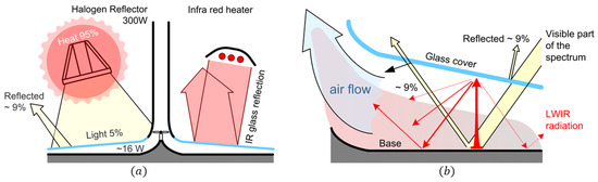 Visualization of the energy balance of a solar chimney power plant. (a) Basic overview of the Greenhouse effect occurring in the solar chimney power plant in the case of a halogen light reflector or infrared heater applied as an energy source. (b) Detailed energy balance of transformation of energy carried by light waves into heat, causing air flow.