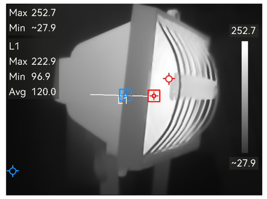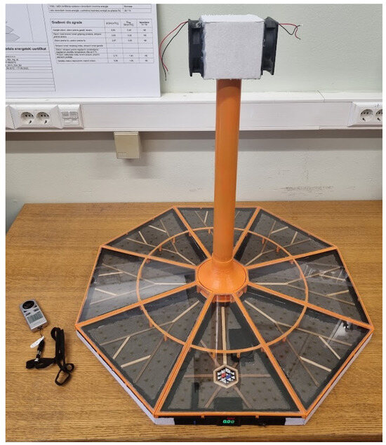 As the mock-up would be used primarily for education purposes, the first option for the enhancer was to introduce artificial sunlight that would cause the Greenhouse effect, as illustrated in Figure 6a. Based on the models (Figure 4), the surface area of the mock-up is approximately 0.45 m2. The value of solar radiation in the Republic of Croatia ranges from 250 to 900 W/m2, which yields that the equivalent value of source dissipation should be approximately 300 W. This corresponds to a simple halogen reflector. The expected useful power on the surface is approximately 16 W, as the balance in Figure 6b suggests. However, a halogen reflector develops temperatures above 250 °C, as the thermogram in Figure 7 shows, and most of the radiation is in the infrared part of the spectrum. Therefore, the dissipation value from such reflectors would create lighter air above the chimney, which would prevent buoyancy. Artificial sunlight as a source is not a realistic option due to the limitations of physical dimensions. Additionally, dissipation using a heater was briefly considered, but that would lead to degradation of the base material, which has to be made of lighter materials for transport and, therefore, has a smaller heat capacity. It was decided to utilize two PC fans with speed regulation at the top of the tower, which would regulate the negative pressure and ensure a variable airflow to rotate the solar chimney turbine. PC fans were used because they are cost effective and widely available, which makes the mock-up easier to reproduce.
