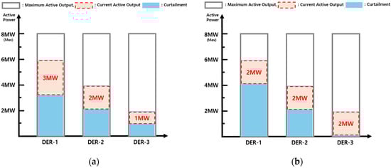 In the current active output-based approach, the curtailment amount for each DER is determined proportionally to its current contribution to the power grid. In this case, the proportionality coefficient is calculated by distributing the total curtailment requirement among DERs based on their current output levels. This method enables fair and real-time curtailment by reflecting the actual operational contributions of each DER to the grid. For instance, as illustrated in Figure 2a, if there are three DERs—DER-1, DER-2, and DER-3—With varying current active output levels, DER-1, which has the highest current active output, will be required to reduce its output by a larger proportion, whereas DER-3, which has a relatively lower output, will be curtailed by a smaller proportion.