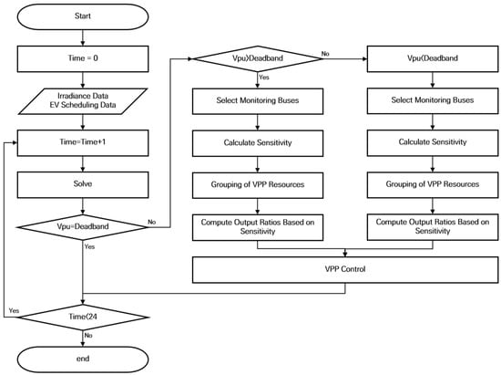 The VPP control algorithm proposed in this study aims to maintain the stability of the power grid by efficiently managing various VPP resources. The algorithm dynamically adjusts the output of resources over time and employs a sensitivity-based ratio control method to prioritize control actions based on the sensitivity of each resource. The overall flowchart of the algorithm is shown in Figure 4.