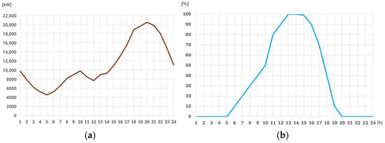 The base case for the simulation scenarios was developed using the load pattern shown in Figure 6a and the solar irradiance data presented in Figure 6b. This base case incorporates the variations in load patterns and solar irradiance over a 24 h period, reflecting the resulting PV output fluctuations. The base case serves as the reference point for analyzing the performance of the simulation scenarios, providing a realistic representation of daily variations in VPP operational conditions.