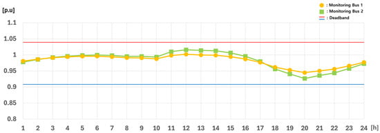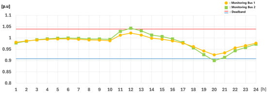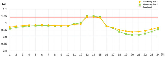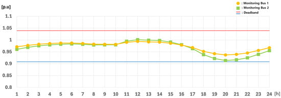 The control results and voltage outcomes using the proposed algorithm are presented in Table 23 and Table 24. In Scenario 2, since no voltage violations occurred at Monitoring Bus 1, control actions were performed solely based on Monitoring Bus 2.