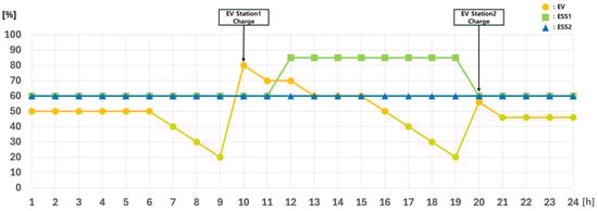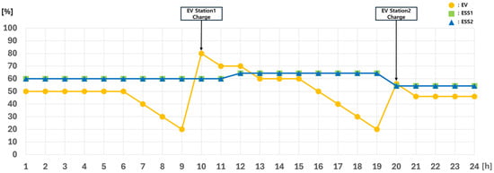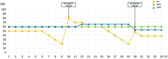 The reason for controlling the charging at EV Station2 instead of EV Station1 at 8 PM is that the EV is scheduled to charge at EV Station2 during that time. The changes in the SOC for the ESS and EV are illustrated in Figure 12.