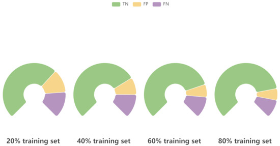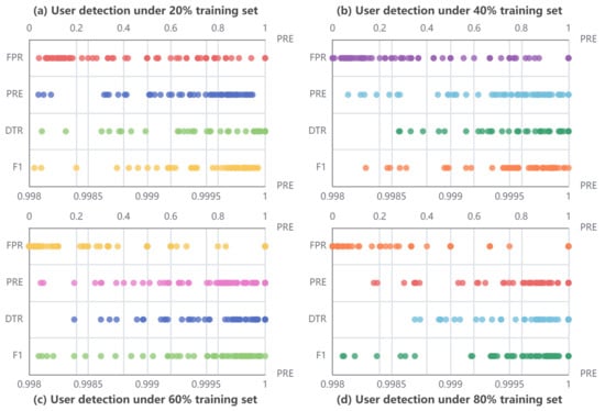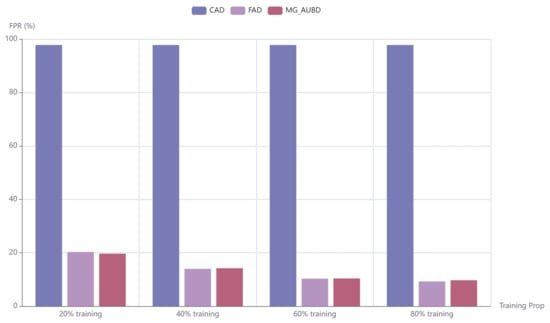 From Figure 8, it can be observed that under varying proportions of the training data, the Precision (PRE) of the CAD module is not high, yet the Detection Rate (DTR) is relatively high. This indicates that the CAD module misclassifies some anomalous behavior samples as normal, but correctly classifies most normal behavior samples. In other words, the CAD module performs well in detecting normal samples. Additionally, as illustrated in Figure 9, the False Positive Rate (FPR) of the CAD module is notably high, exceeding 95%, which is consistent with the high DTR. This signifies that a substantial number of anomalous behavior samples are incorrectly classified as normal, and thus, not detected by the CAD module. The FPR represents missed detections of anomalous behaviors. Although the CAD module has a high recall rate for normal samples when they constitute a significant portion of the dataset, it also tends to classify anomalous samples as normal, leading to a very high false alarm rate for anomalous samples, and consequently, lower detection accuracy.