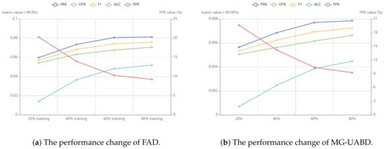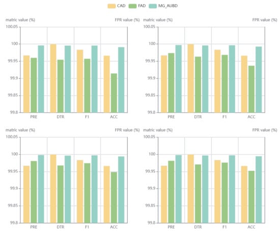 The FAD module, although exhibiting a lower Detection Rate (DTR), shows an improvement in Precision (PRE) compared to the CAD module. This suggests that the FAD module performs better than the CAD module in detecting anomalous behavior samples, mitigating the misclassification of anomalous samples. Furthermore, the False Positive Rate (FPR) of the FAD module is reduced to below 20% compared to the CAD module, indicating a reduction in the misclassification of anomalous samples. The MG-UABD integrates the detection outcomes of both the CAD and FAD modules, combining the strength of the CAD module in detecting normal behavior samples with the strength of the FAD module in detecting anomalous behavior samples. This integration allows for the retention of effective detection of normal behavior samples, achieving a high DTR, while also improving the ability to accurately identify anomalous behavior samples, achieving a higher PRE.