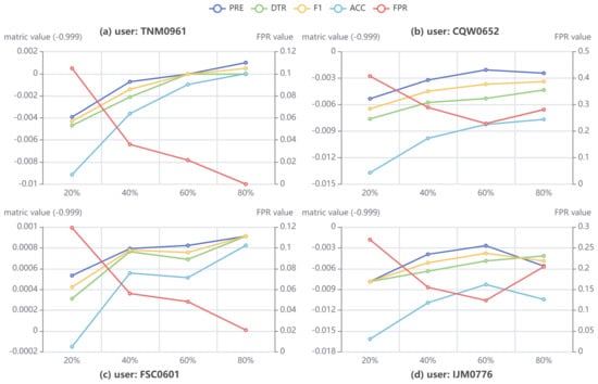 In summary, the quantity and characteristics of anomalous users’ behaviors are more concentrated on device operations (“connect” and “disconnect”) and internet usage (“http”). However, the effectiveness of detecting anomalous behaviors based on device operation behaviors is not as good as that based on internet usage and file behaviors. The detection performance based on a single type of behavior is inferior to that achieved by integrating multiple types of behaviors for comprehensive detection. Therefore, in practical anomaly detection for users, it is recommended to focus not only on internet usage and file behaviors but also to incorporate various types of behaviors for anomaly detection.