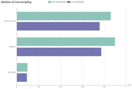 To specifically validate the effectiveness of oversampling for anomaly detection tasks, we implemented comparative experiments with Random Forest, XGBoost, and MG-UABD models, applying oversampling, and visualized the changes in the False Positive Rate (FPR) in Figure 10. From the figure, it can be observed that after applying oversampling, the FPR values for all three models decreased, indicating a reduction in the misclassification of anomalous behavior samples in the test set. This demonstrates that data oversampling can address the issue of insufficient anomalous behavior samples during anomaly detection, thereby enhancing the detection performance of the models.
