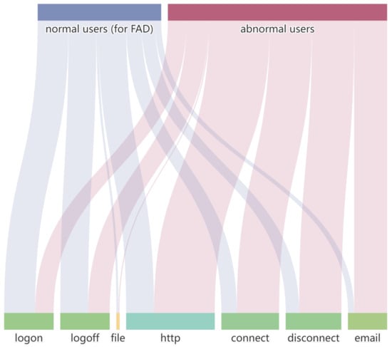 Figure 11 illustrates the correspondence between normal and anomalous users across seven behavior types. For visualization purposes, we have selected only a portion of the normal users from the entire dataset, focusing our analysis on the distribution of behavior types for anomalous users. As shown in the figure, the behavior composition of normal users primarily consists of “logon”, “logoff”, and “http”, whereas the behavior composition of anomalous users is mostly concentrated in “connect”, “disconnect”, and “email”. The “http” type has the largest volume of data, with both normal and anomalous users engaging in this type of behavior.