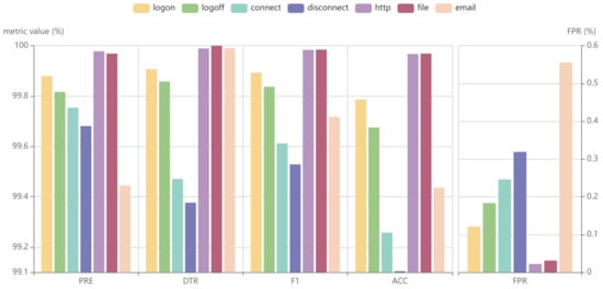 Figure 13 displays the effectiveness of the MG-UABD fine-grained anomaly detection module in detecting anomalous behaviors across different behavior types. From the figure, it can be observed that the best-performing behavior types for anomalous behavior detection are “http” and “file”, followed by “logon” and “logoff”. The poorest performance is seen in “connect”, ”disconnect”, and “email”. Combining the results from Figure 12, we can infer that the behavioral characteristics of anomalous users are concentrated in “connect” and “disconnect”, but once individual anomalous users are subjected to anomalous behavior detection, the distinction between normal and anomalous features for these types is not clear, leading to a higher rate of missed detections. The “http” type has the largest volume of data, and the precision, detection rate, and low false-negative rate for behavior detection based on this type are all high. While the “file” type of behavior data are less prevalent, the detection results are also favorable.