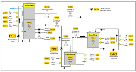 Diagram of the bioleaching plant, highlighting its key components: bioreactor, leaching tanks, and electrolysis unit.