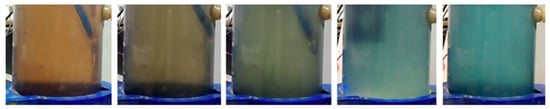 A key feature of our semi-industrial bioleaching plant is the integration of an advanced RGB digital sensor at the bioreactor station. This non-invasive RGB sensor measures Fe (III) and Cu (II) concentrations by detecting color changes in the solution, eliminating the need for complex sampling and analysis. The application of RGB sensors in bioleaching is an underexplored area, offering potential for monitoring microbial activity. RGB sensors operate without direct contact with the corrosive and aggressive liquids involved in chemical processes, significantly extending their operational lifespan. They are not only cost-effective but also offer a clear and reliable correlation with reaction progress, facilitating rapid data acquisition. Unlike standard models that rely on sample extraction, extended analysis times, and manual result interpretation, these sensors enable real-time monitoring. Their implementation in our bioleaching plant can optimize operations by automatically halting the process at the optimal threshold, leading to substantial savings in time, materials, and labor costs. Its performance has been validated by comparing its readings with conventional methods, such as UV-VIS spectroscopy and atomic absorption, demonstrating its accuracy and reliability in the harsh bioleaching environment, as shown in our previous work []. This sensor can detect subtle color changes in the solution (see Figure 2), enabling real-time monitoring and analysis of metal dissolution and recovery processes.