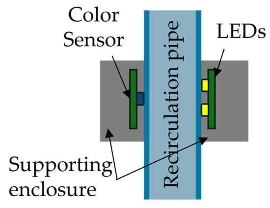 Multiple RGB BH1749NUC sensors [] are strategically placed at critical points in the plant and isolated from the chemically aggressive pH range of 1.6 to 1.8, where the leaching process occurs, using custom 3D-printed enclosures mounted externally to the recirculation pipes (see Figure 3). These transparent enclosures are designed to fit around the pipes, allowing precise measurements. To minimize ambient light interference, a pulsed LED circuit (Figure 3) provides controlled illumination, ensuring accurate color data capture. The sensors demonstrated robustness and reliability in a 24 h ambient light test (day and night), further confirming their suitability for real-world bioleaching applications.