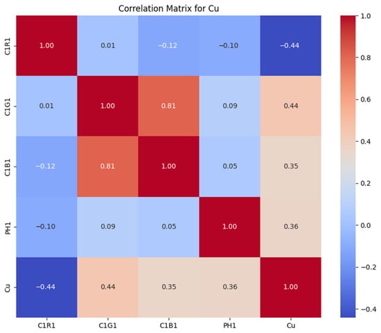 Data visualization and correlation analyses revealed key relationships between RGB values, pH, and copper concentration (Cu) during the bioleaching process. The correlation matrix in Figure 3 shows a negative correlation between the red component (C1R1) and Cu concentration (−0.44), indicating that higher C1R1 values correspond to lower Cu concentrations. Conversely, moderate positive correlations were observed between the green component (C1G1) and pH (pH1) with Cu concentration (0.44 and 0.36, respectively), suggesting that increases in these parameters are associated with higher Cu levels.
