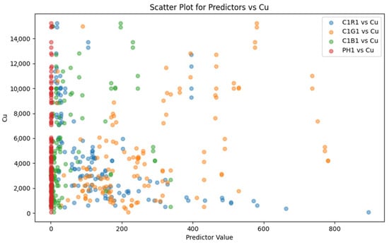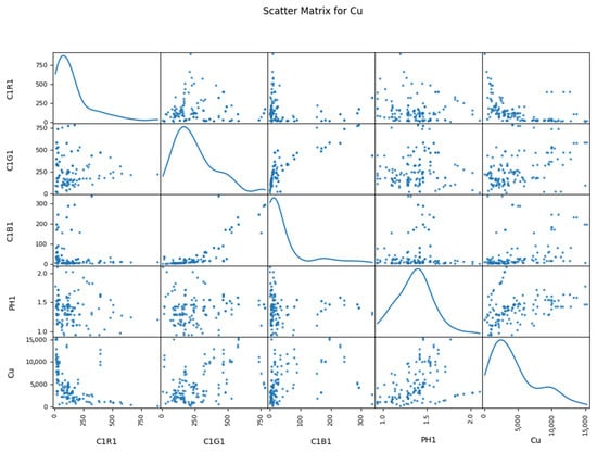 Figure 4 illustrates the correlations of RGB-pH vs. Cu, which are visually confirmed by the scatter plot matrix presented in Figure 5. It illustrates that Cu concentration typically decreases with higher C1R1 values, while positive trends are observed between C1G1, pH1, and Cu concentration, consistent with the numerical correlations. Figure 6 provides scatter plots of each predictor against Cu concentration, further highlighting the influence of each variable on Cu recovery, in alignment with the trends identified in the matrix analysis.