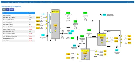 The Flask-based web interface includes user-friendly, real-time dashboards with interactive charts and historical data, enabling trend analysis of key parameters. This functionality supports informed decision making and dynamic adjustments, promoting proactive process management to maintain optimal bioleaching conditions. Figure 20, Figure 21, Figure 22, Figure 23 and Figure 24 are screenshots taken from the Biometallum web-based digital twin, accessible via []. Figure 20 illustrates the Dashboard Page, showing sensor readings and actuator statuses for the bioleaching plant described in Section 1 and depicted in Figure 1.
