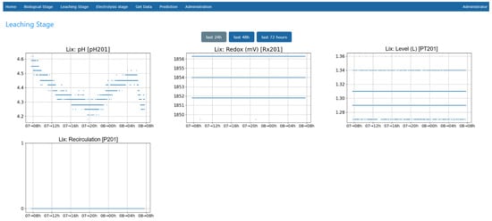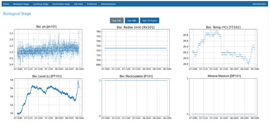 Additionally, the web application features a customizable data extraction interface, where operators can specify time ranges, sampling intervals, and choose sensors or actuators from various process stages. The Get Data page allows for immediate data visualization through generated graphs or CSV downloads for further analysis. CSV files are formatted with timestamps, sensor/actuator names, and recorded values, facilitating targeted analysis and informed decision making to enhance operational efficiency. Figure 21 shows graphical representations of sensor readings relevant to the biological stage of the process, with adjustable time period settings. Similarly, Figure 22 illustrates sensor readings for the leaching stage, also allowing for time period adjustments.