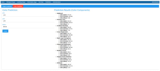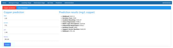 Currently, the system uses the methods detailed in Section 2 (AdaBoost, decision tree, gradient boosting machine, linear regression, multilayer perceptron, polynomial regression, random forest, support vector machine, and XGBoost) to analyze historical data and predict copper recovery efficiency under various conditions. This predictive capability enables technicians to make proactive adjustments, preventing critical thresholds from being surpassed. By incorporating these models, the system can optimize operational parameters, improving metal recovery efficiency and the sustainability of the bioleaching process. For instance, the system can identify patterns in copper dissolution rates, recommending optimal reagent addition times or adjusting leaching solution flow rates.