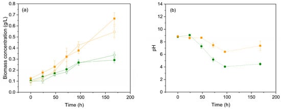 (a) Growth curves during 7 days for Scenedesmus sp. in the presence (doped—solid green circle) or absence (control—open green circle) of EDCs and C. vulgaris in the presence (doped—solid orange square) or absence (control—open orange square) of EDCs. (b) pH curves over 7 days for doped Scenedesmus sp. (circle, dashed green line) and doped C. vulgaris (square, dashed orange line). Error bars represent ± standard error of the mean (n = 3).