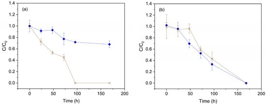 Phosphate (brown cross) and ammonium (blue diamond) removal by (a) Scenedesmus sp. and (b) C. vulgaris in the presence of EDCs. Error bars represent ± standard error of the mean (n = 3).