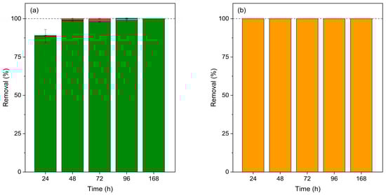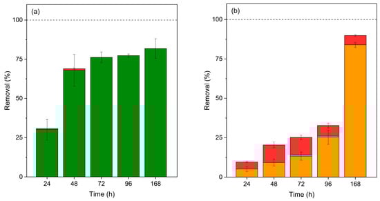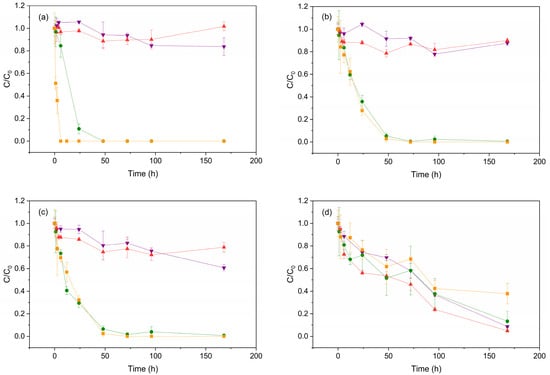 Figure 4, Figure 5, Figure 6 and Figure 7 depict the contribution of the different removal mechanisms (abiotic, biosorption, bioaccumulation, and biodegradation) for the studied contaminants within 7 days. The results were calculated using Equation (1) and expressed as the amount of contaminant removed concerning its initial concentration for each experiment.