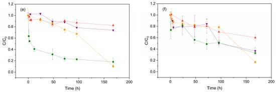 BPA degradation is shown in Figure 3e. This contaminant was removed in abiotic conditions (O and LO experiments) by 20%, which agrees with the results previously reported []. In addition, the photodegradation (L experiment) of BPA was negligible, as depicted in Figure S1 (Supplementary Material). BPA removal increased significantly from the first day in the LOM experiment with Scenedesmus sp. In contrast, significant BPA elimination in the LOM experiment with C. vulgaris was observed from day 4 onwards, coinciding with its exponential growth phase and the decrease in ammonium and phosphate levels, as shown in Figure 1a and Figure 2b, respectively. By the end of the 7 days, both Scenedesmus sp. and C. vulgaris achieved high BPA removal efficiencies, reaching 82% and 90%, respectively. These results are aligned with previous studies, such as the removal rate of 96% for BPA within 90 h using a consortium of Chlorophyceae-class microalgae and cyanobacteria, using a starting initial BPA concentration of 10 ppb []. On the other hand, Li et al. (2009) reported a degradation of BPA of nearly 92% within 16 days using Stephanodiscus hantzschii in a medium containing 1 ppm of this contaminant [].