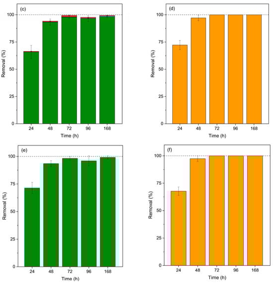 The primary removal mechanism for parabens in both species was biodegradation (Figure 4a–f). However, Scenedesmus sp. also showed a low percentage of biosorption and bioaccumulation of MeP (Figure 4a) and PrP (Figure 4c). The adsorbed fraction exhibited a consistent trend for these compounds, initially increasing from day 1 to day 3 (from 0.43 to 1.71% for MeP and from 0.57 to 1.44% for PrP), and subsequently decreasing until day 7, reaching less than 0.04% for MeP and 0.64% for PrP. On the other hand, the bioaccumulated fraction of MeP increased during the initial days from 0.04–0.11% to 0.88% but showed an almost complete reduction (<0.04%) by day 7. Conversely, the bioaccumulated fraction of PrP showed an upward trend from day 1 to day 7, increasing from less than 0.005% to 0.58%. These results suggest that MeP and PrP presented a slow diffusion into the cells, and MeP probably underwent biodegradation by intracellular enzymes. The adsorbed and bioaccumulated fractions for BuP (Figure 4e) were negligible, accounting for less than 0.08% of the total contaminant concentration removed. The concentrations detected in both measurements were below the LOD.