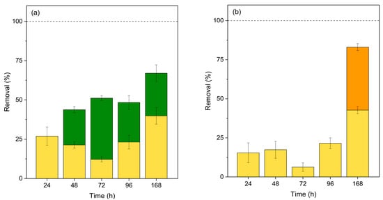 Contribution (%) of abiotic degradation (yellow), and biodegradation (green Scenedesmus sp. and orange C. vulgaris) in E removal by Scenedesmus sp. (a) and C. vulgaris (b). Error bars represent ± standard error of the mean (n = 3). Contribution of biosorption and bioaccumulation are not plotted because both are negligible.